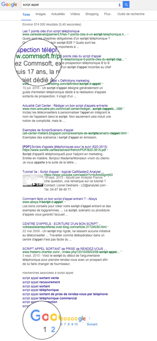 Il faut en premier lieu préciser sur quelle requête : « script appel ». Normal, Commsoft est expert de la prospection téléphonique BtoB. Il n’y a pas de trucage 😉 faites le test !