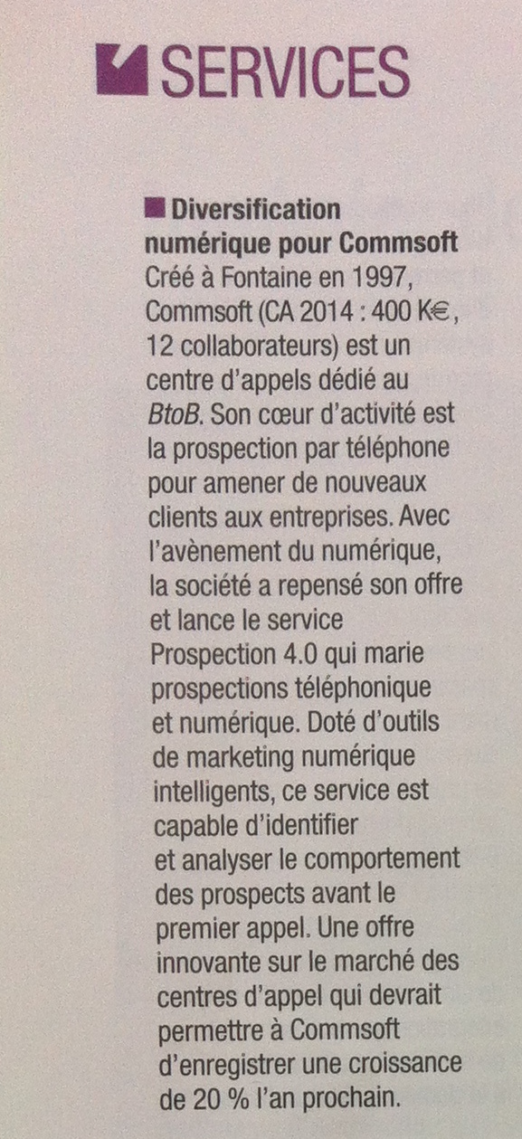 Spécialiste de la prospection téléphonique B to B, Commsoft (Dirigeant-fondateur : Laurent La Rosa ; CA 2014 : 400 K€ ; Fontaine) a développé des outils de marketing digital « capable… Lire la suite.